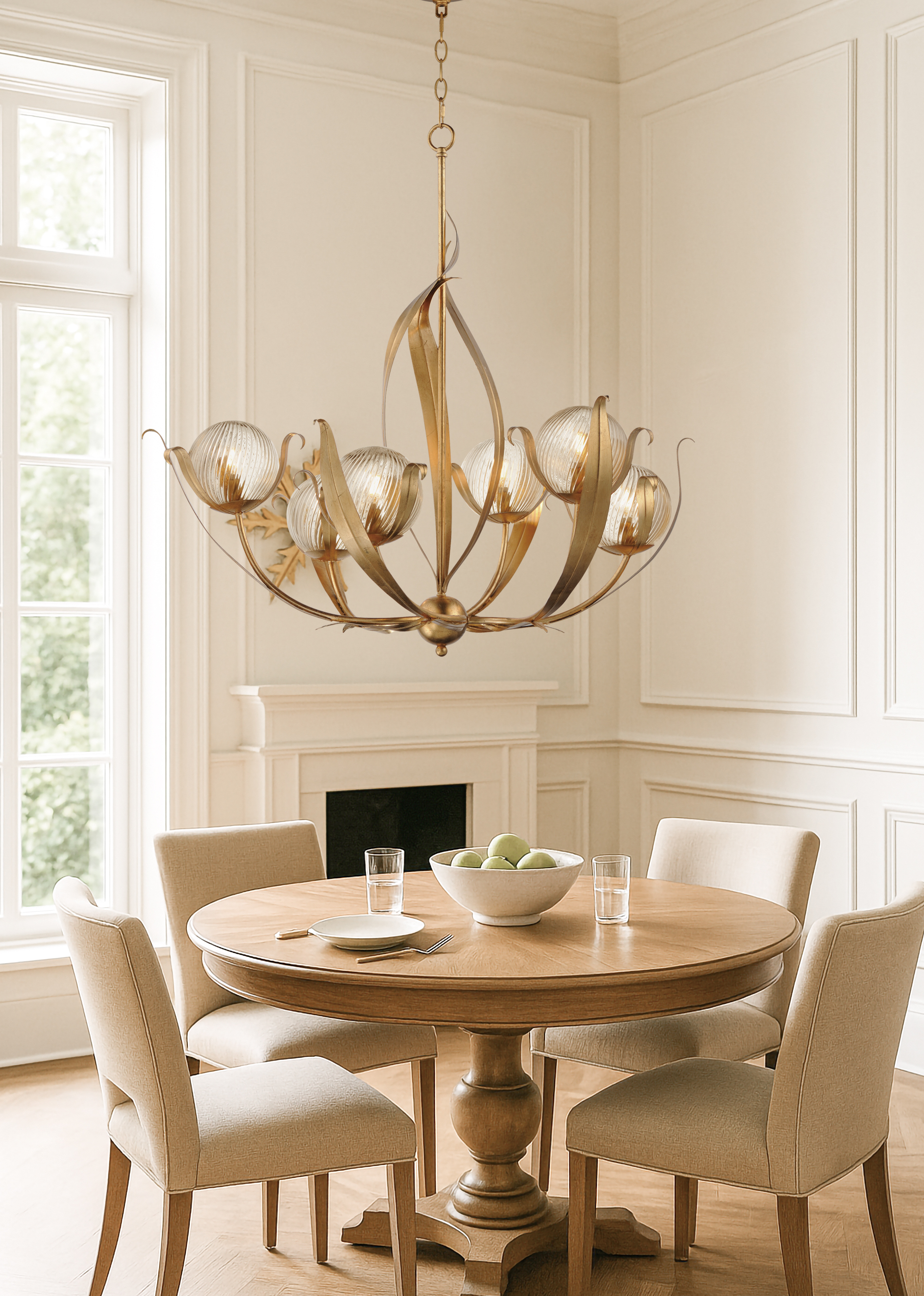 Celebrating the beauty of nature through sculptural, biophilic design. Delicate leafy forms rise in graceful motion, supporting spiraling clear ribbed glass globes that encase the light in luminous movement. Inspired by the romantic swirl of Italian glassworks, each piece feels both organic and artful. Finished in hand-applied gold leaf, Firenze brings warmth, texture, and botanical elegance to chandeliers, pendants, semi-flush mounts, and sconces, transforming spaces with a graceful balance of artistry and light.