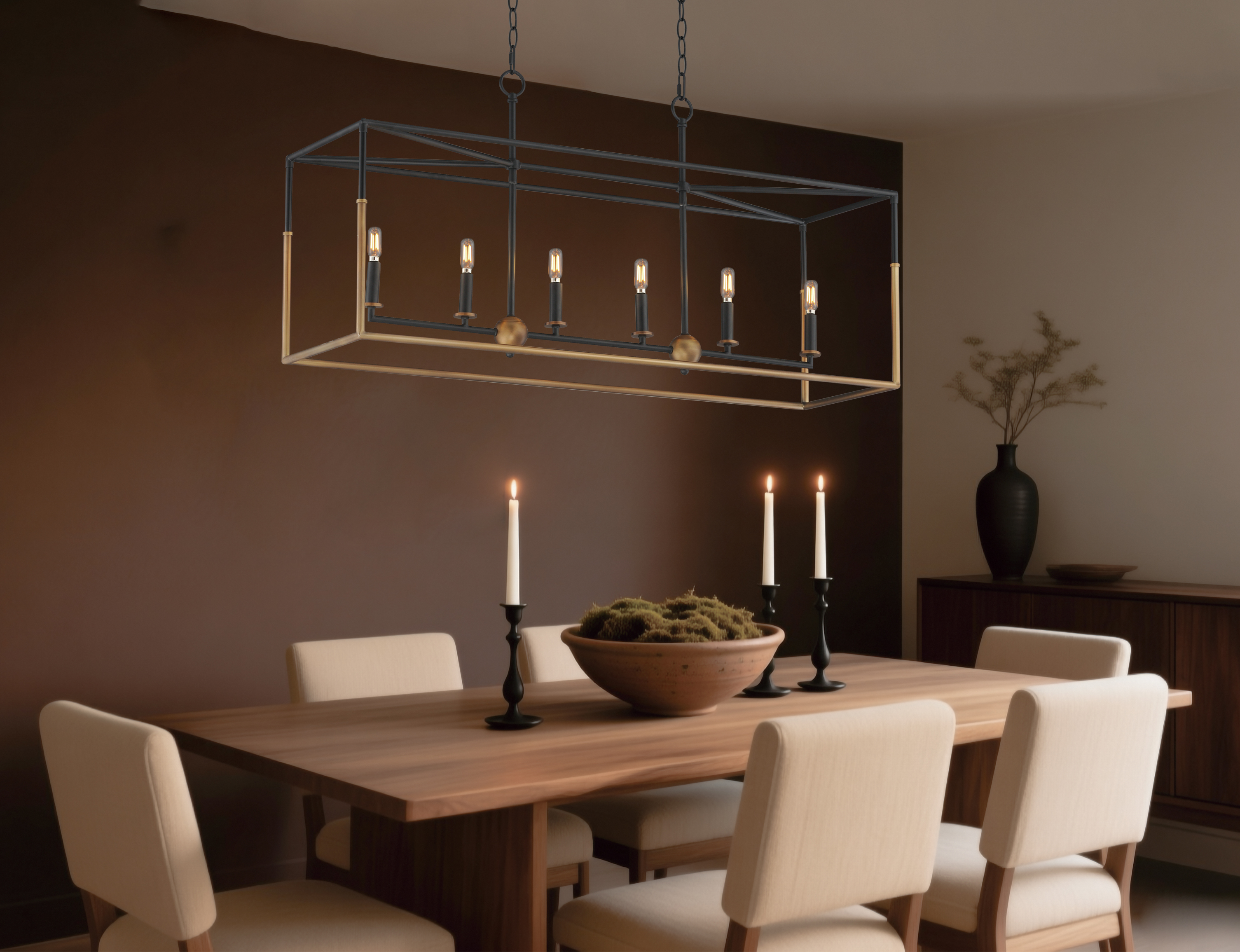 A modern take on the classic caged lantern, Soho frames light within a bold square silhouette softened by warm contrast. Matte Black pairs with Weathered Brass to create depth, balance, and an inviting glow suited to transitional interiors. Inside the structured cage, a cluster of candelabra lamps flickers with sculptural warmth, blending strength and softness. Clean-lined yet atmospheric, Soho adds contemporary character to entryways, dining rooms, and gathering spaces.