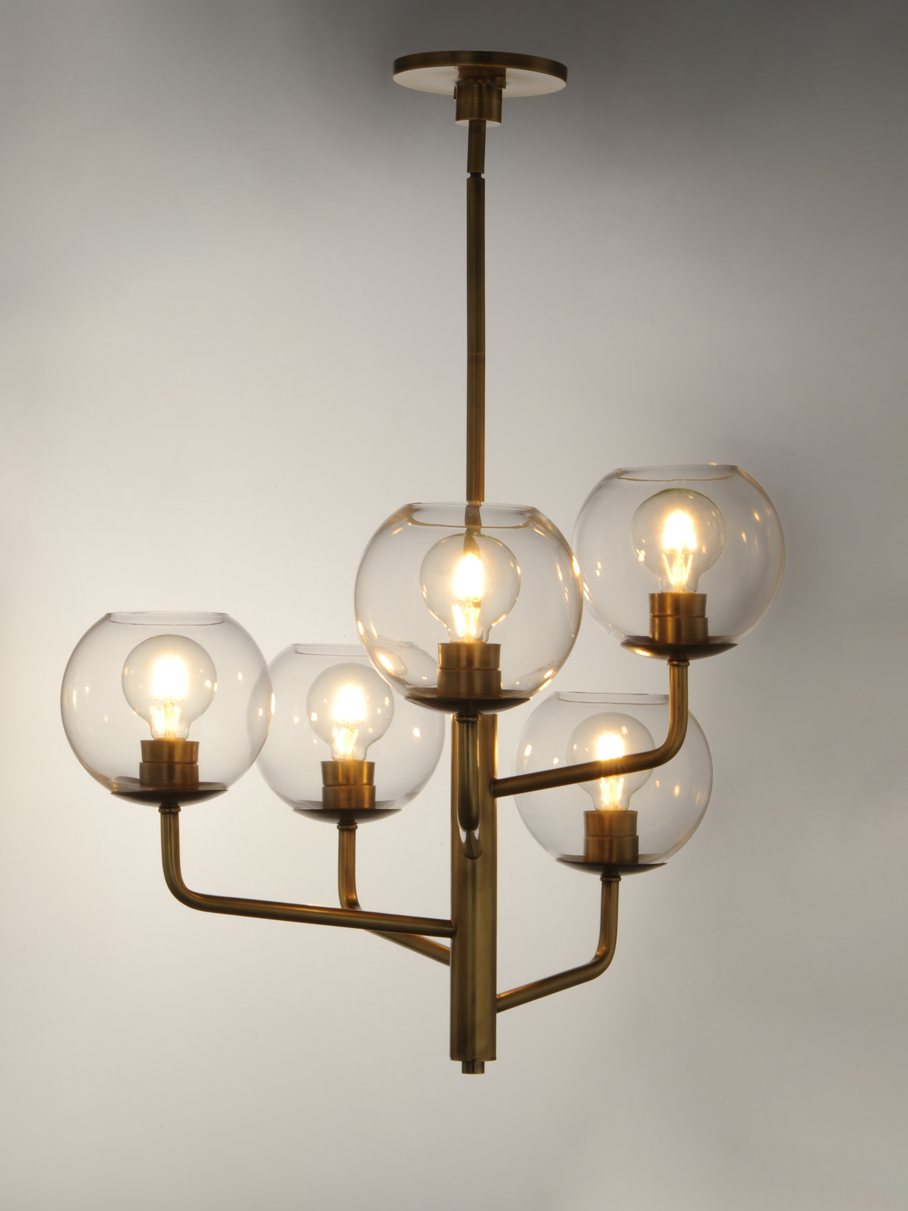 Vessels of heavy weight Clear glass are supported on frames of solid brass finished in a hand rubbed Natural Aged Brass finish. A versatile collection of up and down configurations which can be directly attached to the canopy or extended down by the rods supplied.