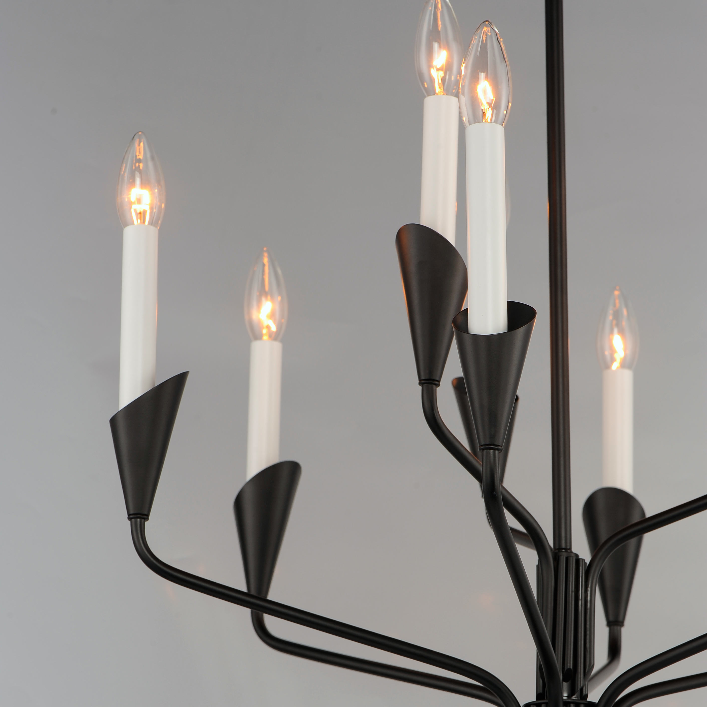 An arrangement that features Black tubing bouqueted at a point with biotic bobeches that contain elongated white candle covers. The organic form of this collection brings visual interest to the collector that is constructed of irregular stem lengths. The tailored composition of the look with its formal black and white finishes is elevated by its reference to nature. Added designer detail perfectly suited for any interior space. An accompanying ADA compliant wall sconce presents a unique option for corridor applications.