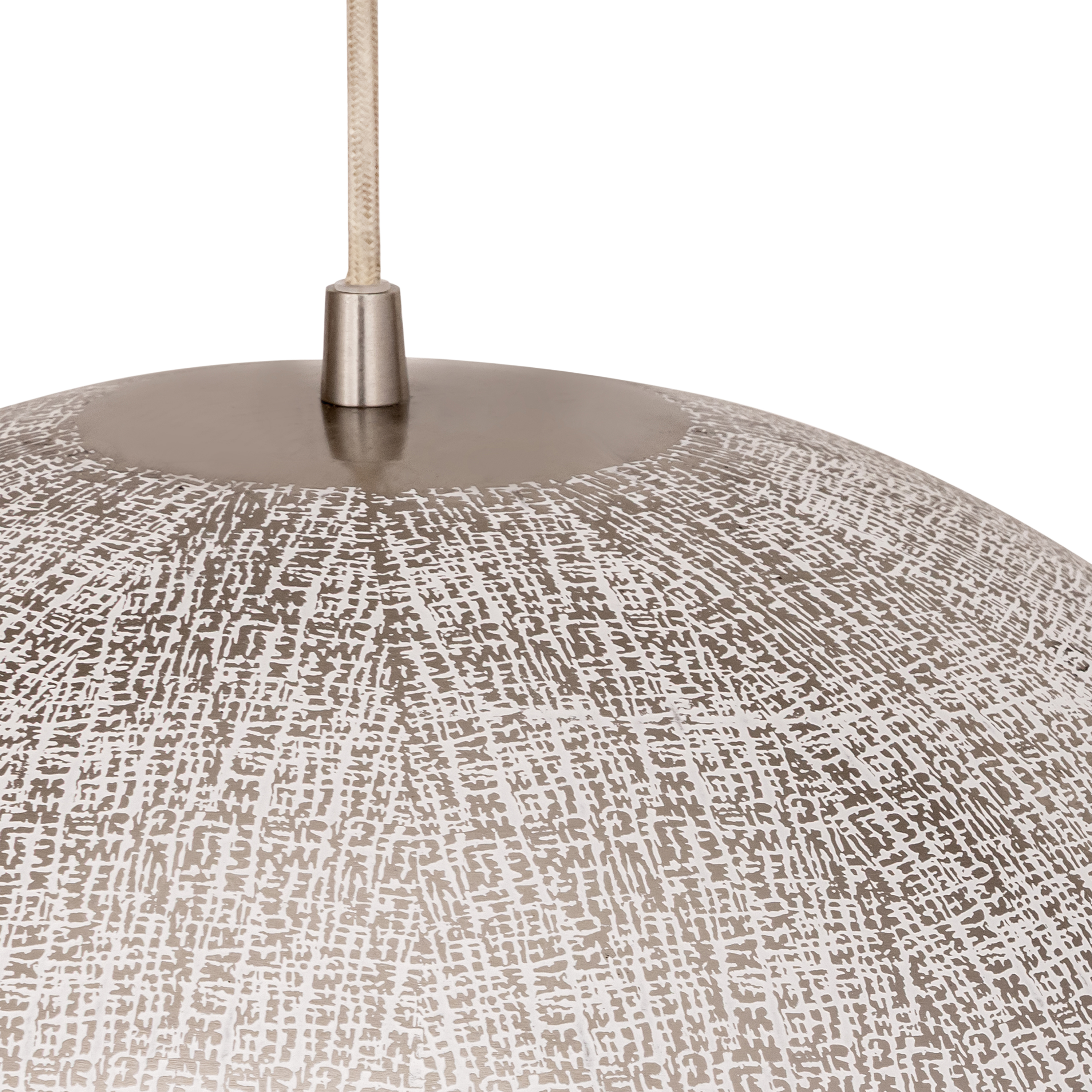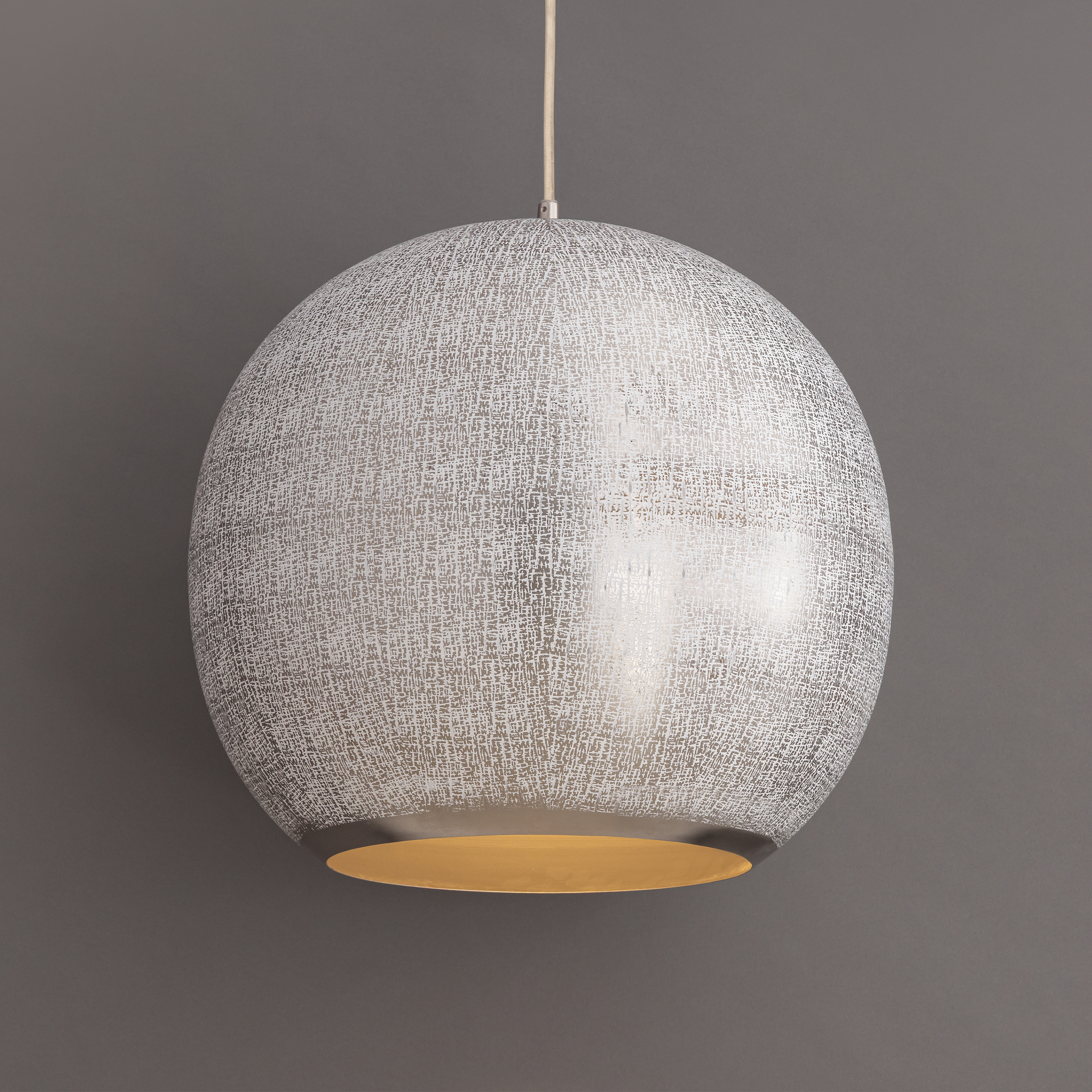 Rooted in ancient artistry and shaped for modern spaces, Aurelia is a study in timeworn opulence. Each globe pendant is formed from etched metal with a soft, tactile finish that evokes handcrafted metalwork. Finished in a warm brass tone, the shade conceals the light source entirely, casting a gentle, ambient glow that radiates from within. A black rayon cord adds a refined contrast, while a coordinating ADA-compliant backlit wall sconce completes the collection with subtle drama. Offered in multiple sizes, Aurelia brings a timeless, sculptural presence to any interior.