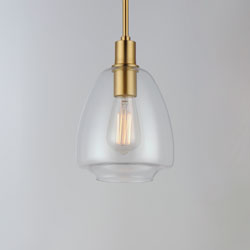 Pendants of Clear glass in unique elongated and undulating shapes with various sizes. This series pairs well with popular finishes in hardware and plumbing, giving you the flexibility to take chances with designer statement pieces. The metalwork is available in your choice of Matte Black, Satin Brass, or Satin Nickel. A coordinating wall sconce pairs well with the collection. Use filament bulbs to complete the look.