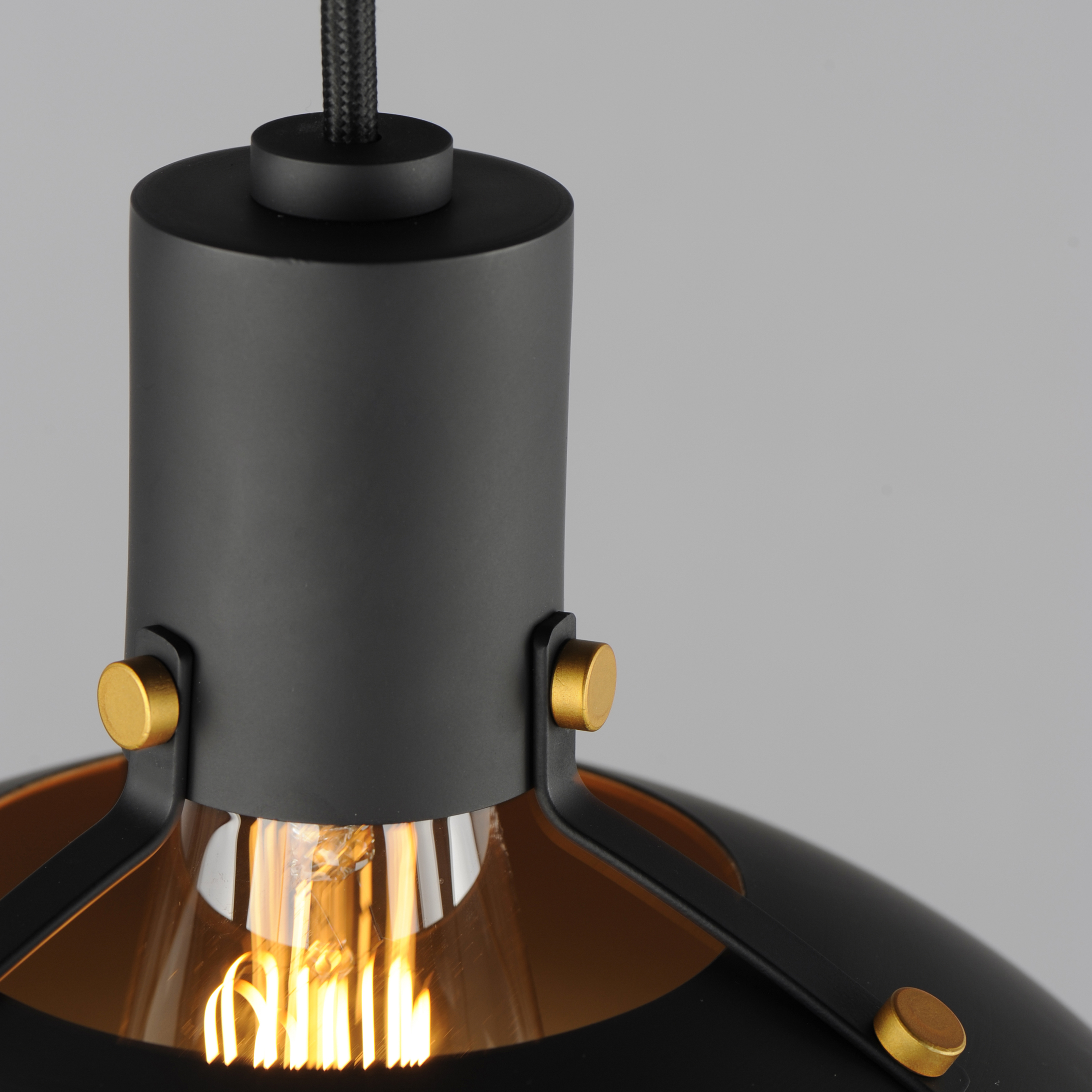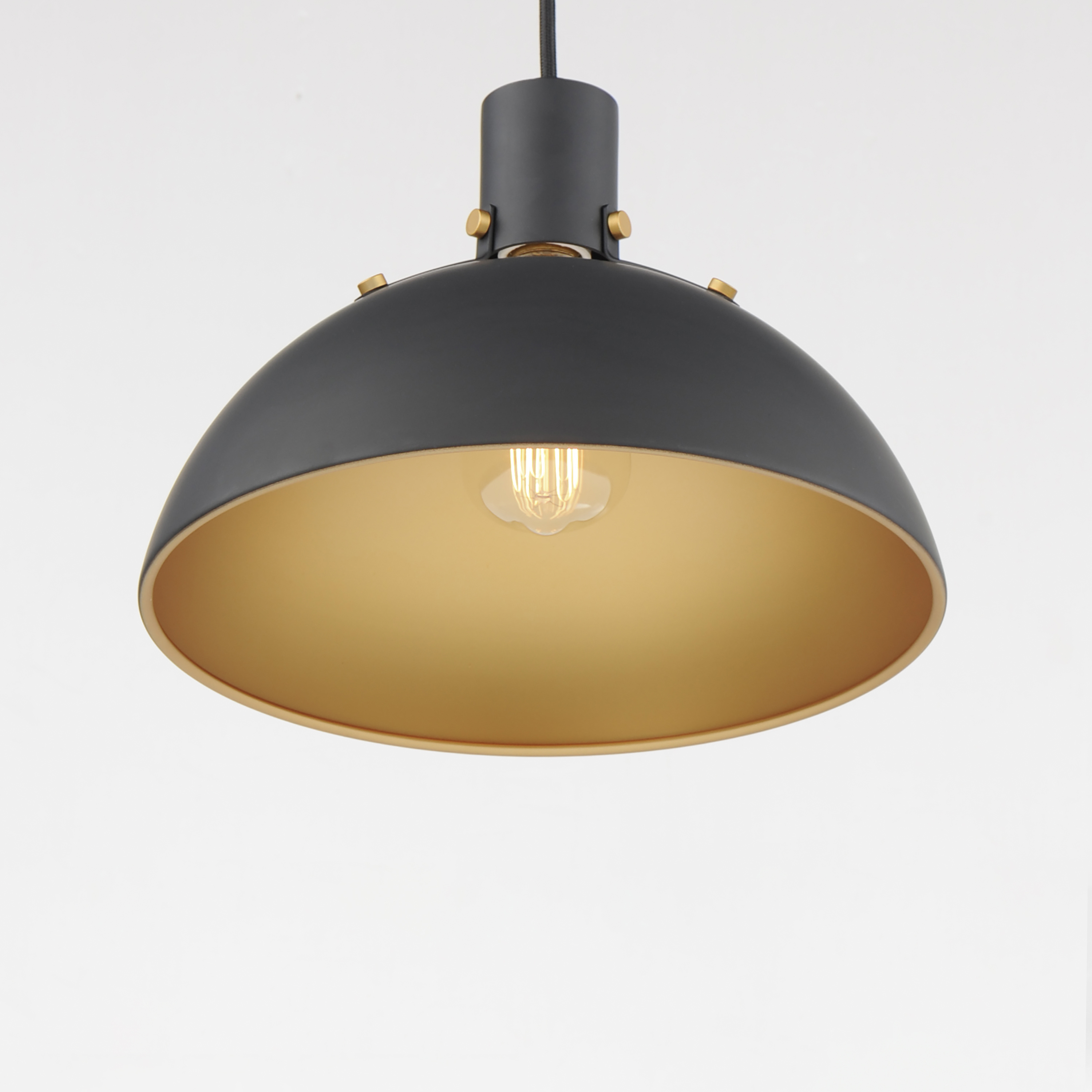 Sockets are suspended above a metal spun dome in your choice of Black or White with Gold accents or Satin Nickel with Black accents. A clean and simple approach to modern or transitional lighting, the opening allows light to shine through the opening atop while providing functional light below. This break in the two parts is supported with straps and decorative rivets in complimentary finishes for a subtlety tasteful two-tone finish. A coordinating pin-up wall sconce offers a bedside application to this design with integrated switch on its back plate and two feet of cord cover that can be removed and hardwired per your preference.