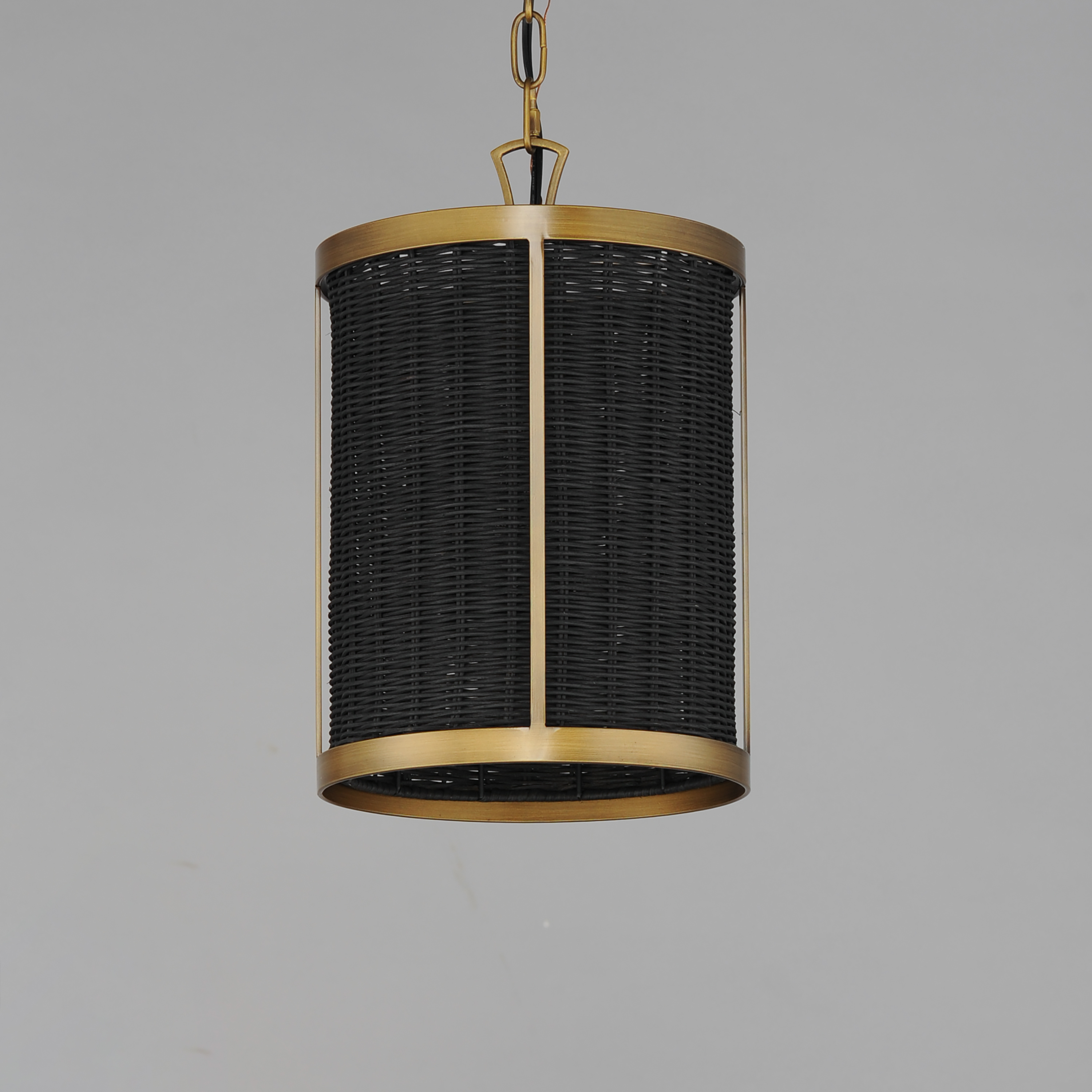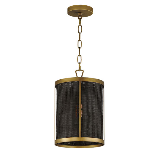 Hand-woven rattan is blackened and configured into a series of pendants and a dual-purpose wall sconce and flush mount. The blackened rattan is contrasted by a frame in Natural Aged Brass that adds a dramatic styling to the natural material. The overall effect is nostalgic, coastal, and yet transitional with a variety of design aesthetics.