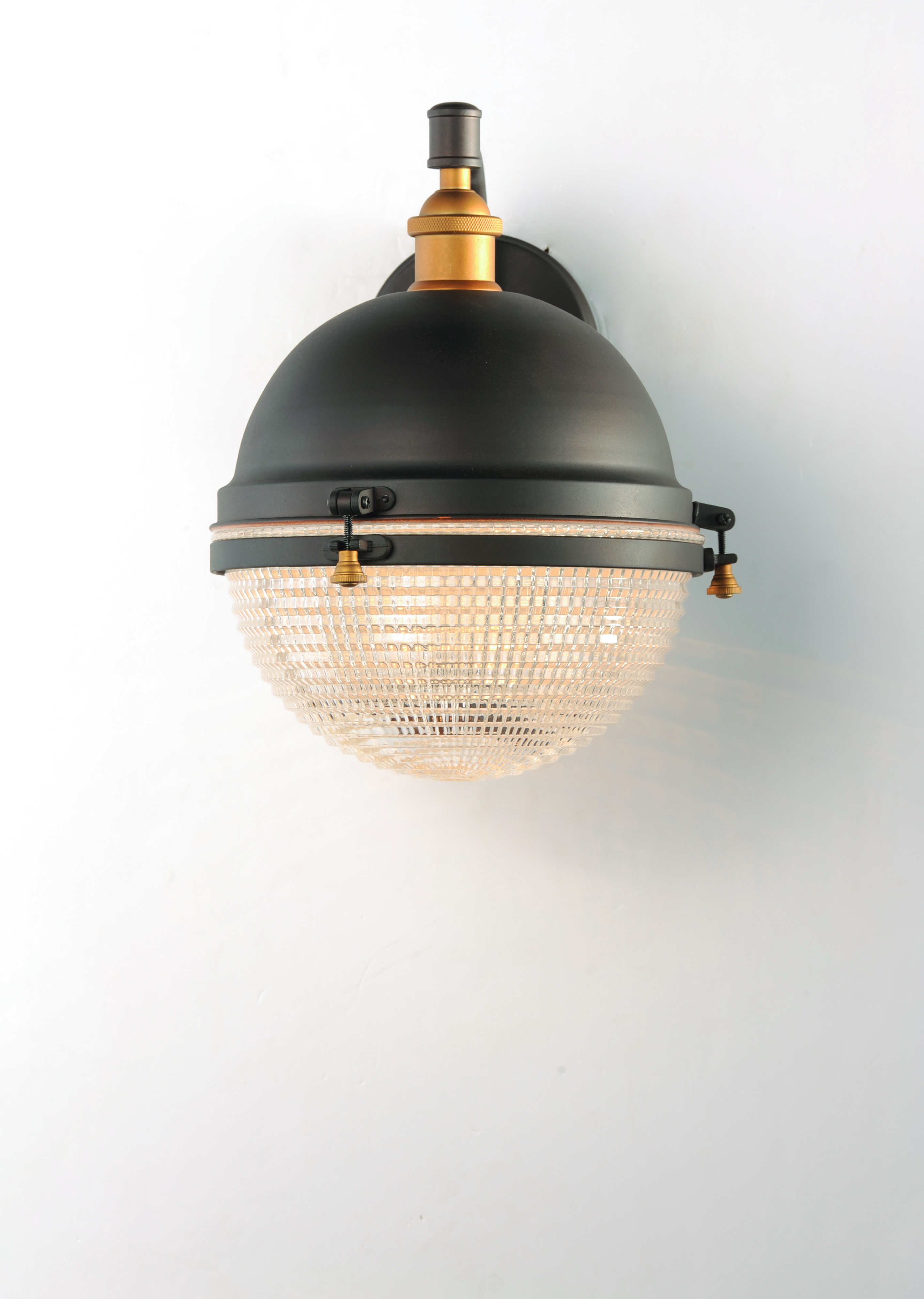 This nautical design features a solid dome of aluminum finished in Oil Rubbed Bronze with solid brass hardware finished in Antique Brass. The Clear prismatic glass diffuser completes the authentic look of this outdoor collection.